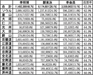 李明博候補は、ハンナラ党の念願だった「反ハンナラ党心理の強い湖南(全羅南・北道、光州。鄭東泳候補の地元)での得票率の2ケタ台達成」にはわずか及ばなかったものの、湖南を除き全国で得票率トップとなった。