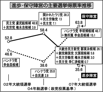 保守陣営の得票率は、李明博候補48・7%に李会昌候補(無所属)15・1%をあわせると63・8%にもなる。これに対して与党系・進歩陣営の得票率は、鄭東泳候補26・1%に文国現候補(創造韓国党)5・8%、権永吉候補(民主労働党)3・0%、李仁済候補(民主党)0・7%を足しても35・6%にすぎない。5年前の選挙での52・8%(盧武鉉48・9%、権永吉3・9%)に遠くおよばなかった。