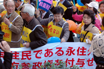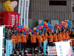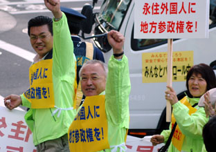 「地方参政権を付与せよ!」。そろって右腕を力強く突き出して