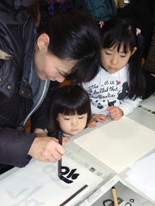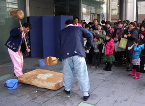 ソルナル(旧正月)を体験する韓国文化院の企画イベント「韓国のお正月の風景展」が22・23の両日、東京・新宿区の同院で開かれた。 4階のサランバンで行われた「歳拝(セベ)と徳談(トクダム)体験」には、多くの日本人女性が参加。目上に対するあいさつの仕方や、良い1年を過ごすために目上が話す徳談について説明を受けた。 初めて韓国式のあいさつをした60代の女性は、「思ったより簡単だった」と笑みを浮かべた。 2階では正月に遊ぶユンノリやチェギチャギ、トゥホ(矢投げ)といった伝統遊戯をはじめ、ハングルの書き初め、龍の拓本、折り紙コーナーなどが設けられ、家族連れやカップルらでにぎわった。2歳と6歳の娘を連れて初めて参加した母親は、「漢字と違って書くのが楽しい」と話し、6歳の娘も頑張って書き上げた。 22日には100食のトックと、前韓国文化院院長の姜基洪さんから贈られた長方形の木臼と杵を使って餅つきした後、参加者たちに振る舞った。 60代の住吉登志子さんは、「日本では、親族が集まるのは法事くらい。伝統文化が残っているのは素晴らしく、家族を大事にすることも理解できた」と話していた。 (2012.1.25 民団新聞) |