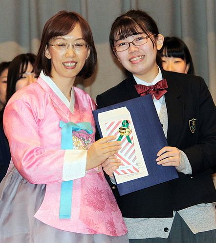 学生の部では7人全員に「千葉韓国教育院長」が贈られたほか、最優秀賞の田口怜奈さんにはソウル往復航空券がプレゼントされた。