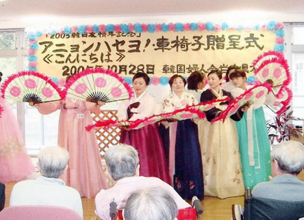 岩手県本部 特別養護老人ホーム「山岸和敬荘」を慰問。韓国舞踊などを披露し車イス2台を贈呈した。この時の模様は地元のテレビで放映された=05年10月28日