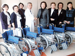 山口県本部 祭りにチヂミや韓国食品を販売した収益金で購入した車イス10台を福祉センター「昭和病院」に寄贈した=2月27日