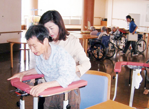 鳥取県本部 アジメ奉仕隊の慰問活動で老人保健施設「ふたば」に入所している朴徳守さん(83)の歩行練習を手伝う金良子さん