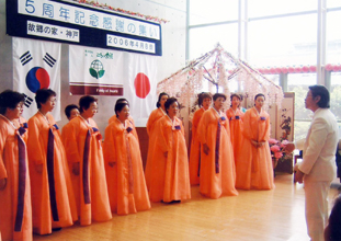 福井県本部 特別養護老人ホームでの慰問公演でチャングや韓国舞踊、民謡を披露した=05年10月11日