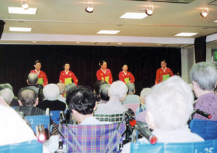兵庫県本部 高齢者福祉政策活動で老人ホーム「故郷の家・神戸」5周年記念式典に合唱部が出演=05年4月9日。老人ホーム「メリンハウス西風新都」も慰問した