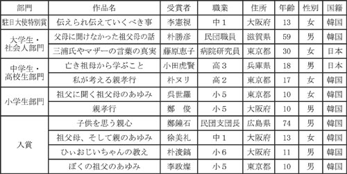 審査委員長の李愚京中央民族教育委員長は「どの作品からも、祖父母や父母の苦労を思う感謝の気持ちが伝わってきた。特に、在日の渡日史やルーツが描かれた作品は、審査するというより、考えさせられ、教えられることが多かった」と評している。