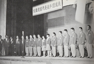 東京五輪に参加した韓国選手団の歓迎会。横幕に「大韓民国代表選手団萬歳」と書いてある(64年10月)