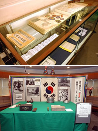 韓国中央会館ロビーに展示された古い太極旗などの品物 |