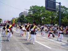 行列には婦人会・青年会など各団体のサムルノリ隊が力強い演奏を披露。可憐なチマチョゴリ姿の女性たちや「ヴィジットジャパン」と称し、韓国からも参加者が集まった。