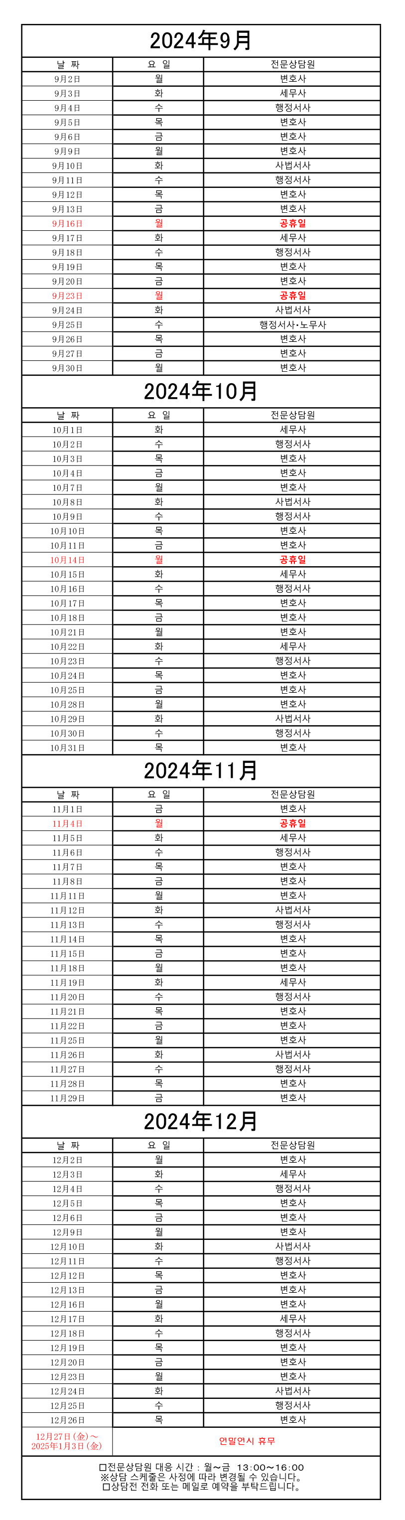 2024년9월-2024년12월 생활상담센터 전문상담원 당번표