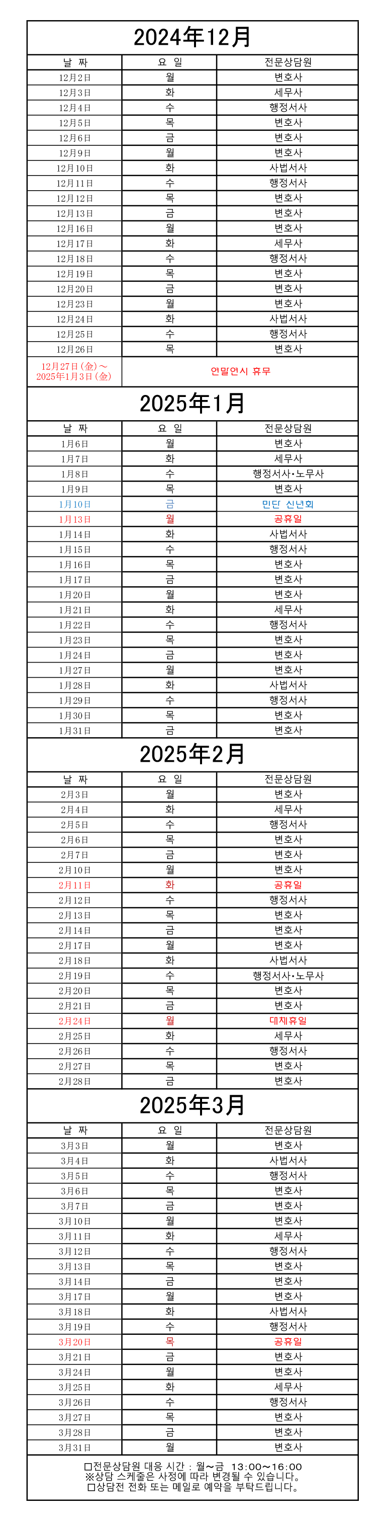 2024년12월-2025년03월 생활상담센터 전문상담원 당번표