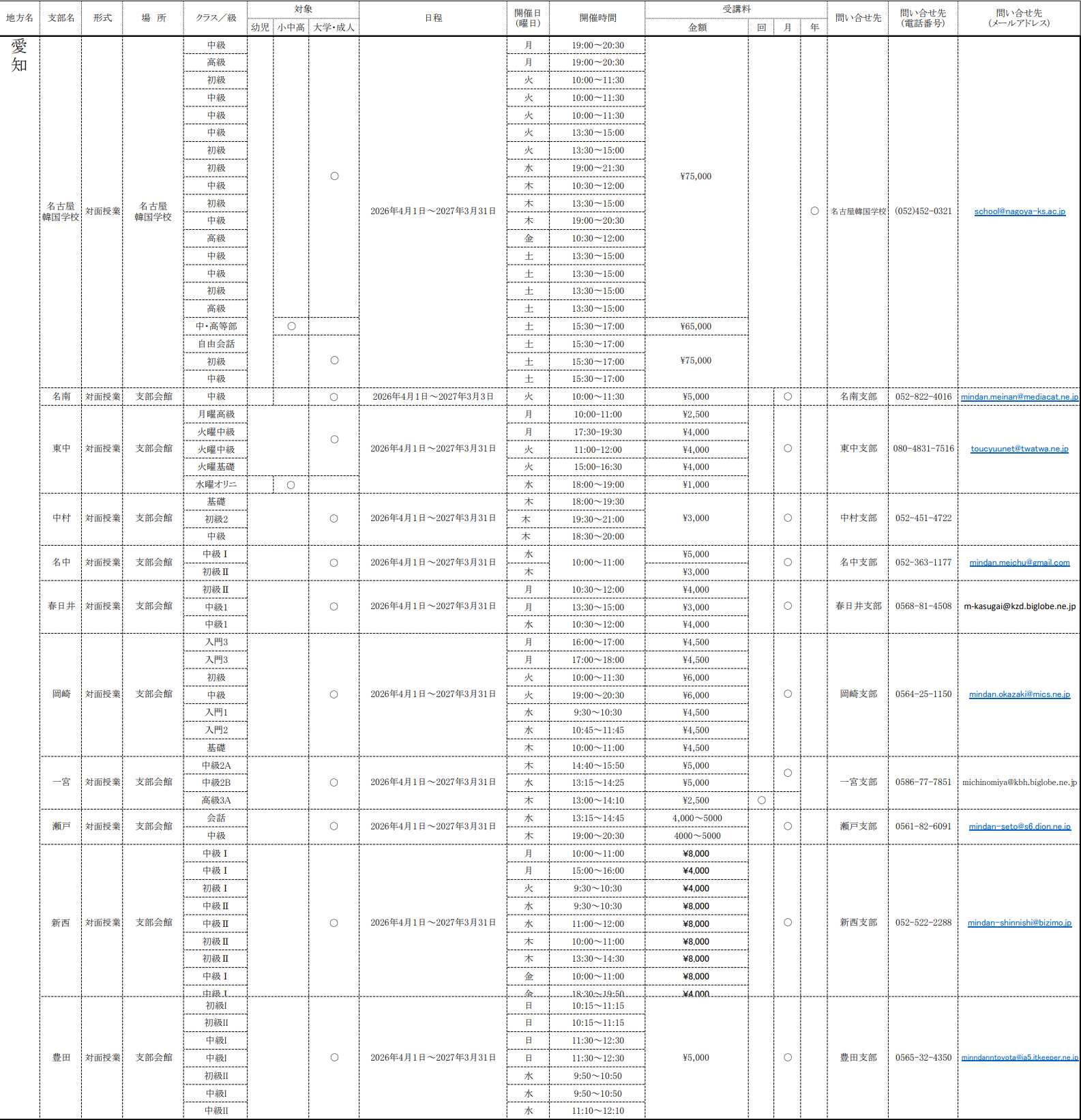2026年度 各地の韓国語教室<中北地区>
