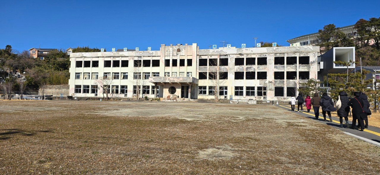 2日目には、石巻南浜津波復興祈念公園にある「みやぎ東日本大震災津波伝承館」を訪ねた。宮城県石巻市は、約4千人が亡くなった国内最大の被災市村村で、その中でも南浜地区は津波の襲来とその後に発生した火災の延焼により500人以上の方々が亡くなった地域である。館内では、震災当時の状況を記録した映像「くり返さないために」を視聴し、ガイドの説明を受けながら展示を見学した。そこには、被災した街の写真や証言、資料が並び、自然災害の恐ろしさと防災の重要性を改めて感じさせられた。その後、伝承館から石巻市震災遺構門脇小学校に移動した。門脇小学校は津波火災による被災状況を残す全国で唯一の震災遺構であり、津波の猛威と火災の脅威を生々しく物語っていた。この日の訪問を通して、震災の恐ろしさと共に「命を守る行動の大切さ」を強く心に刻んだ。