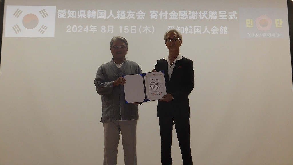 記念式典に先立ち、愛知県韓国人経友会から解散に伴う2,600万円の寄付金が各所にあったことを受け、民団が代表して感謝状の授与式を行いました。