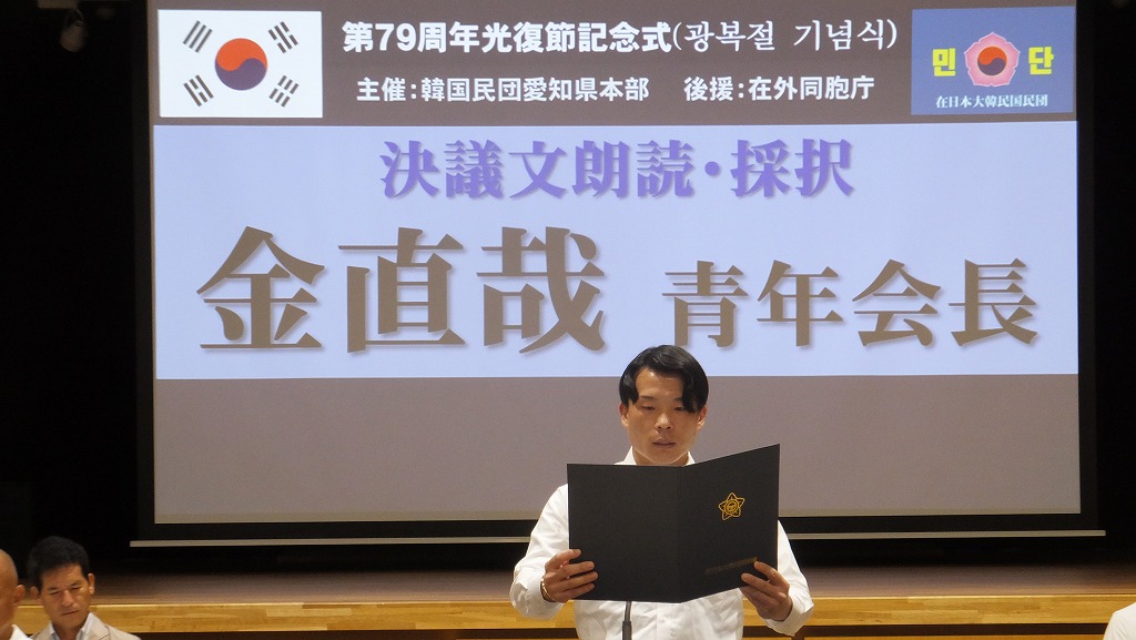 本式典では、金星秀総領事による尹錫悦大統領の慶祝辞代読、民団愛知県本部の河隆實団長のあいさつに続いて、金直哉青年会長による決議文の朗読があり、満場一致で採択されました。