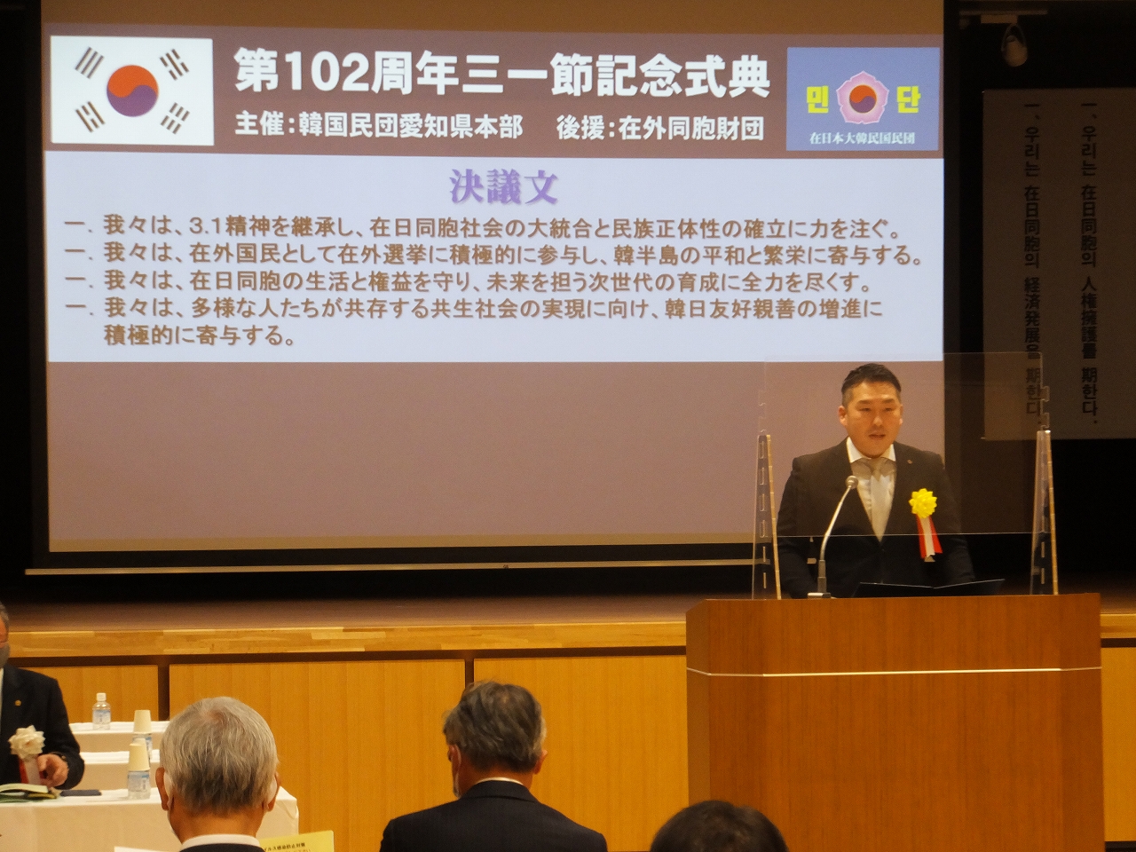その後の記念式典では、名古屋韓国学校の李孝心校長による「己未独立宣言書」の朗読、朴先哲総領事による文在寅大統領の記念辞代読や、民団愛知県本部の朴茂安団長のあいさつに続いて、決議文の採択が行われました。