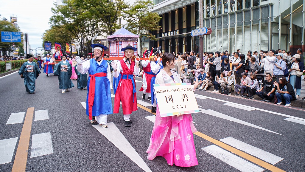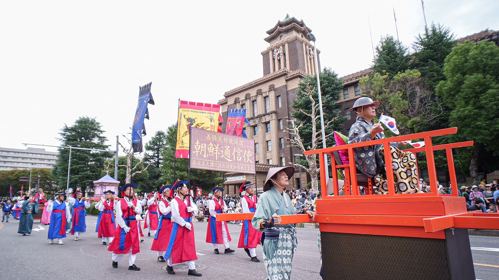 江戸時代、豊臣秀吉による朝鮮出兵(壬辰倭乱・丁酉倭乱)で悪化した両国関係を改善しようと徳川家康の呼びかけに、対日外交の復活を願った李氏朝鮮から国書を携えた朝鮮通信使隊が海を渡りやってきました。通信使とは「信(よしみ)を通わす使い」の意味です。