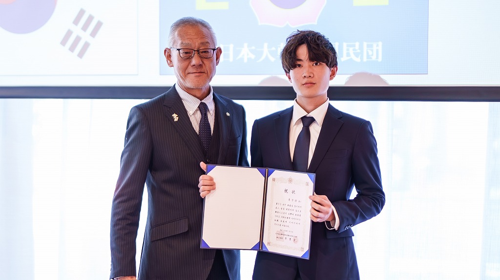 答辞の後には、今回ご協賛をいただいた、一般社団法人在日韓国商工会議所愛知、婦人会愛知県本部からの記念品贈呈があり、新成人を代表して李亜蘭さんに手渡されました。