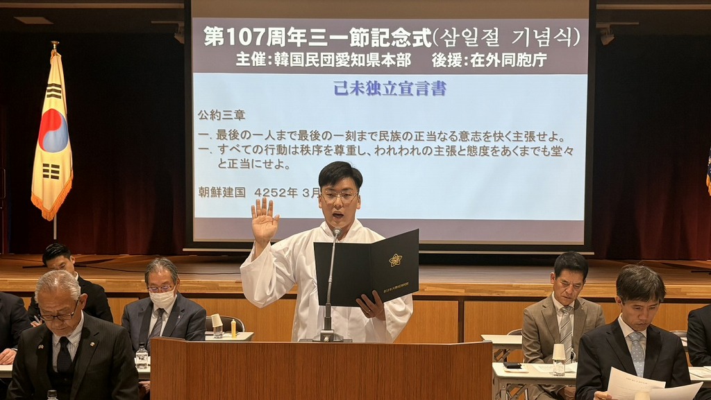 記念式典では、県本部の呉炫栖事務員による「己未独立宣言書」の朗読、崔副総領事による公館長記念辞や、民団愛知県本部の李団長のあいさつに続いて、青年会愛知県本部の金直哉会長による決議文の朗読が行われ、満場一致で採択されました。