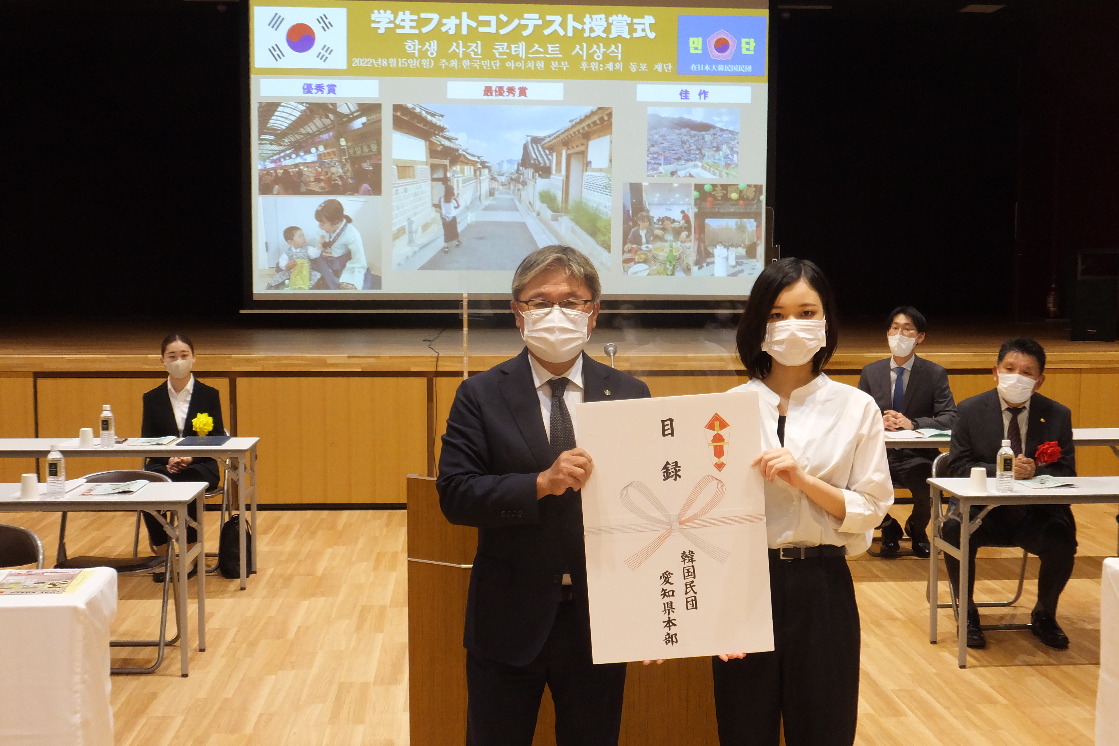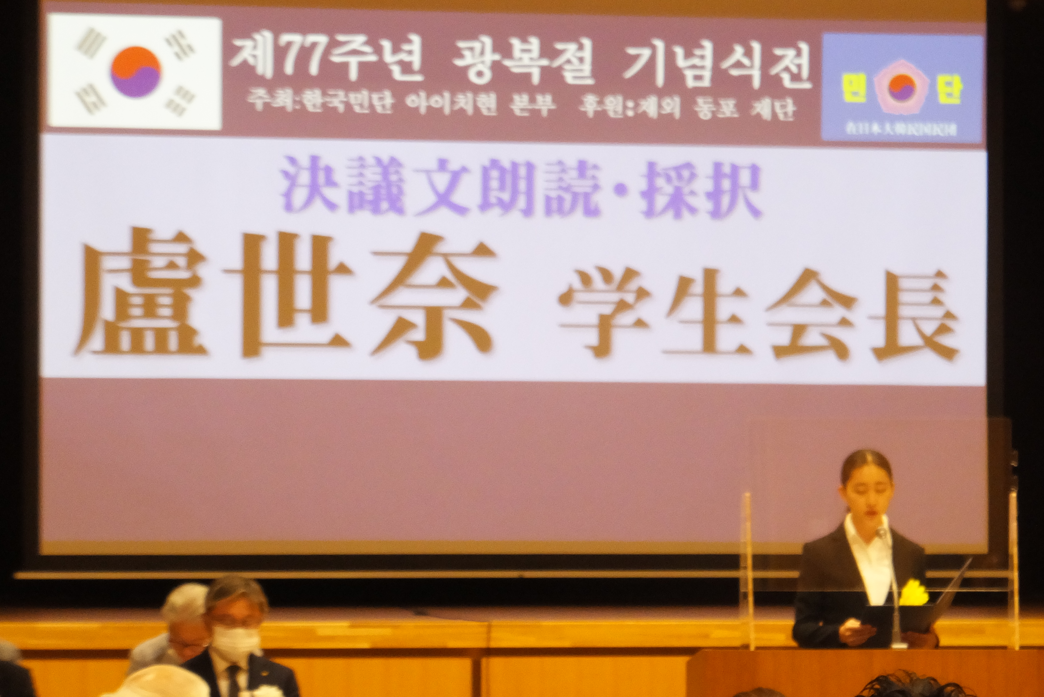 記念式典に先立ち、6月に募集を行った「学生フォトコンテスト」の最優秀賞、優秀賞、佳作各賞の表彰式を執り行いました。引き続き行われた式典では、朴先哲総領事による尹錫悦大統領の慶祝辞代読、民団愛知県本部の河隆實団長のあいさつに続いて、盧世奈学生会長による決議文の朗読があり、満場一致で採択されました。