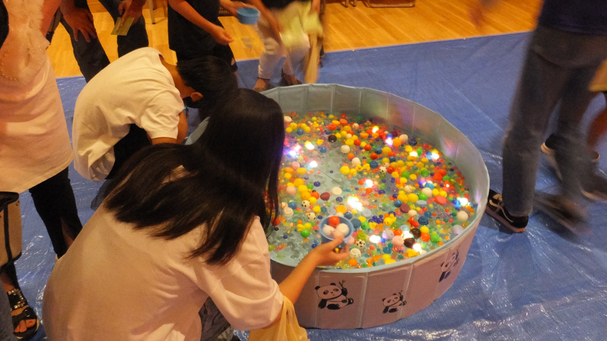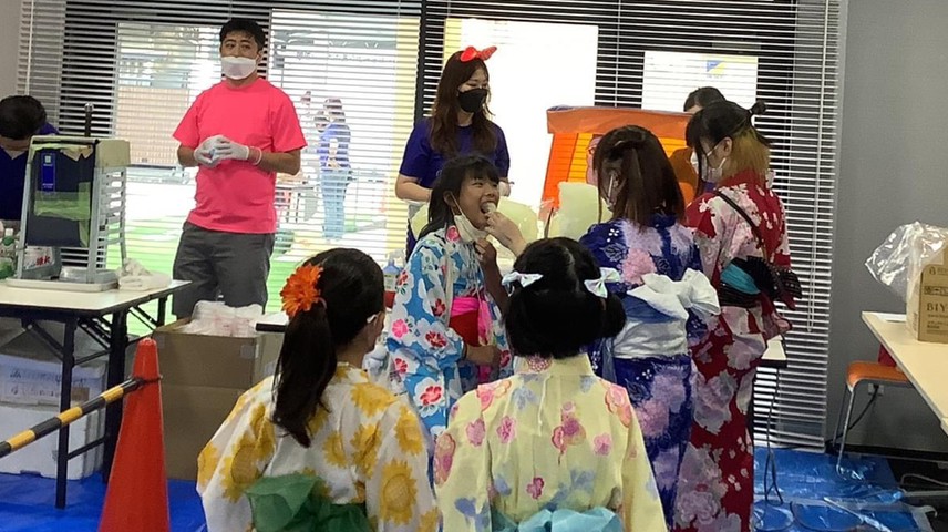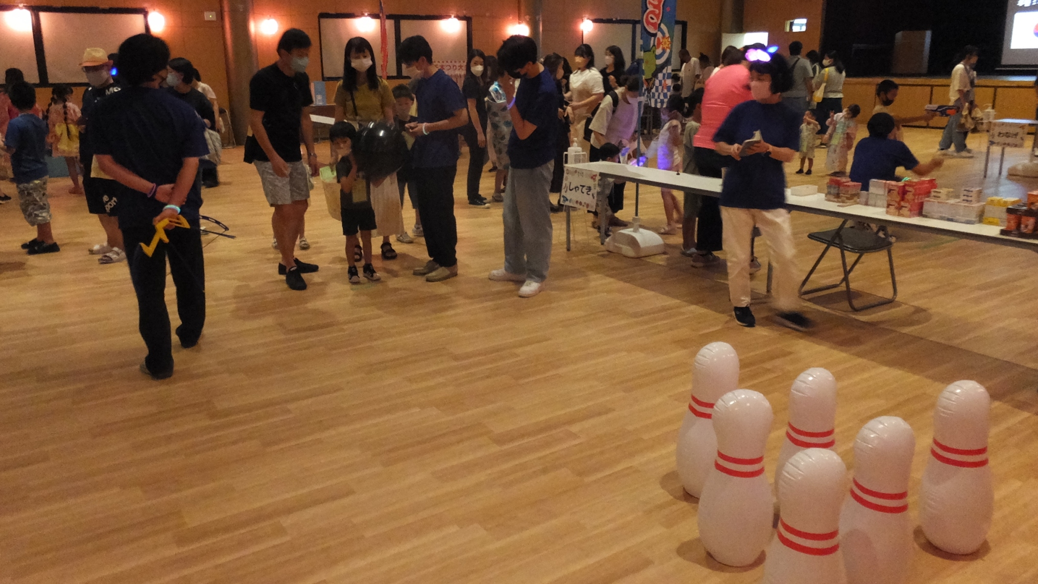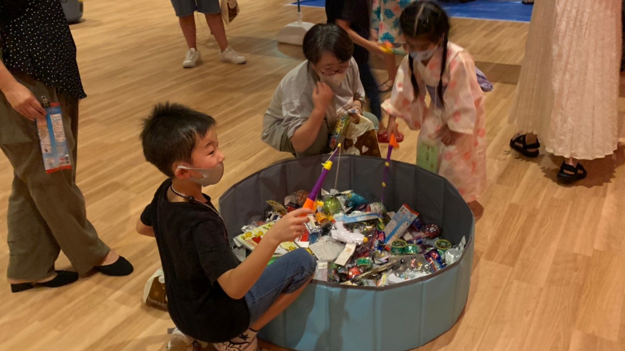 今回のコンセプトは「夜祭り」、薄暗くした会場に赤ちょうちんを飾り付け、プロジェクターで花火を映し出す演出で参加者を出迎えました。合間には盆踊りの曲と映像を流し、子供たちはもちろん、大人も子供の頃を思い出して楽しみました。