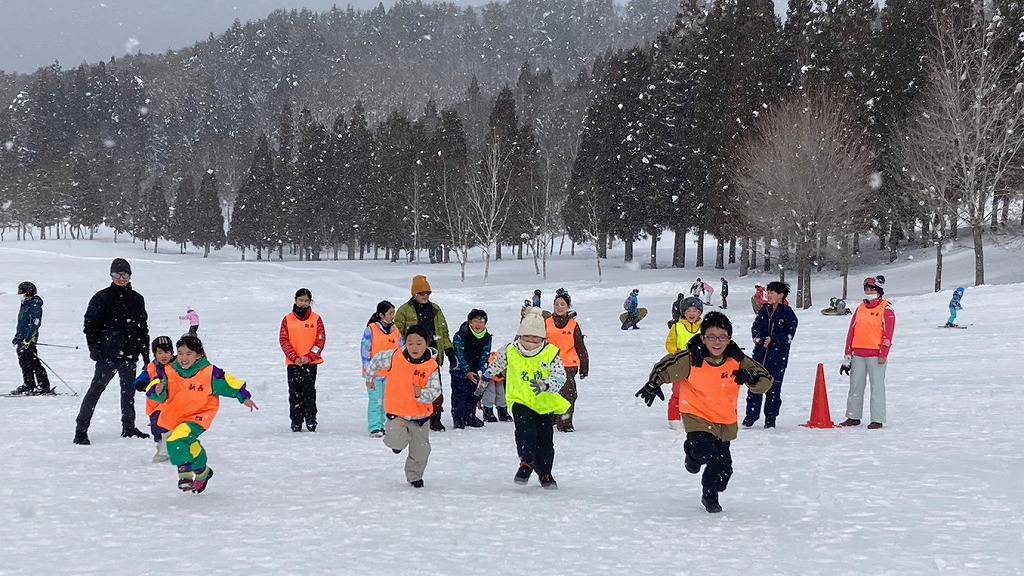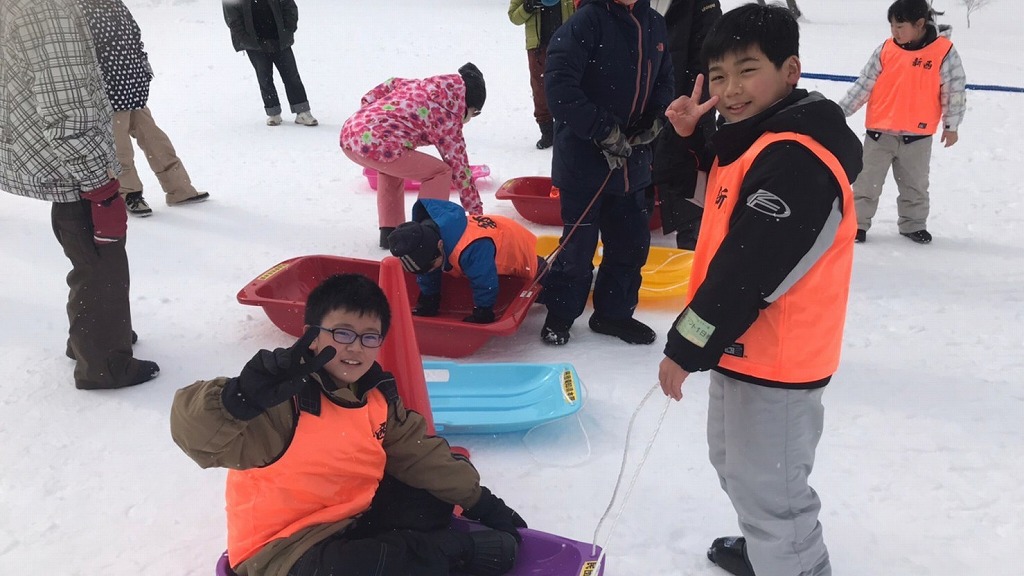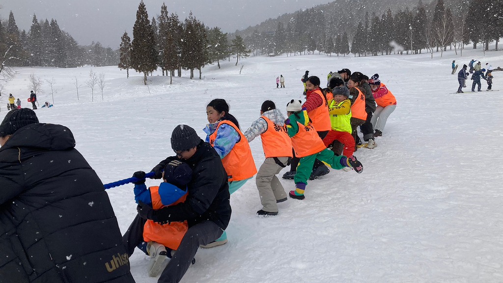 この日は企画として雪上運動会「ホワイトフェスタ」を開催、スノーフラッグ、ソリ引きレース、つなひきで競い合い、参加したオリニには参加賞としてお菓子が贈呈されました。