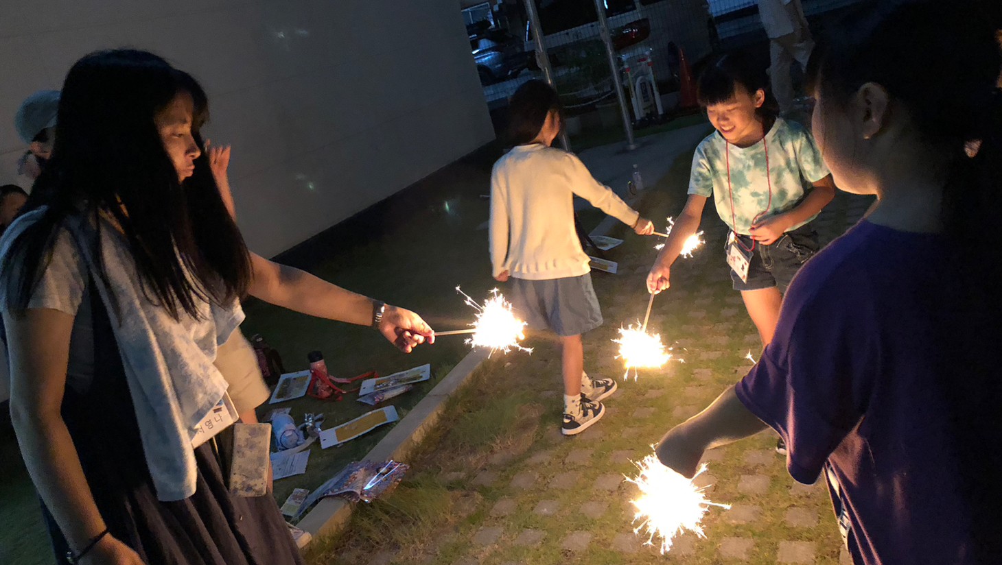 初日はまず、近隣のトヨタ産業技術記念館へ社会科見学、本部会館前のスペースを使ってバーベキュー、県本部の成功副団長からの高級肉の差し入れを楽しみました。バーベキューが終わってからは子供ではなかなか味わえない「銭湯体験」、隣接している韓国学校をお借りして闇夜のスタンプラリー、最後は花火を楽しみました。宿泊も本部会館で、ホールにテントを張り、寝袋で寝るというキャンプ気分を味わいました。