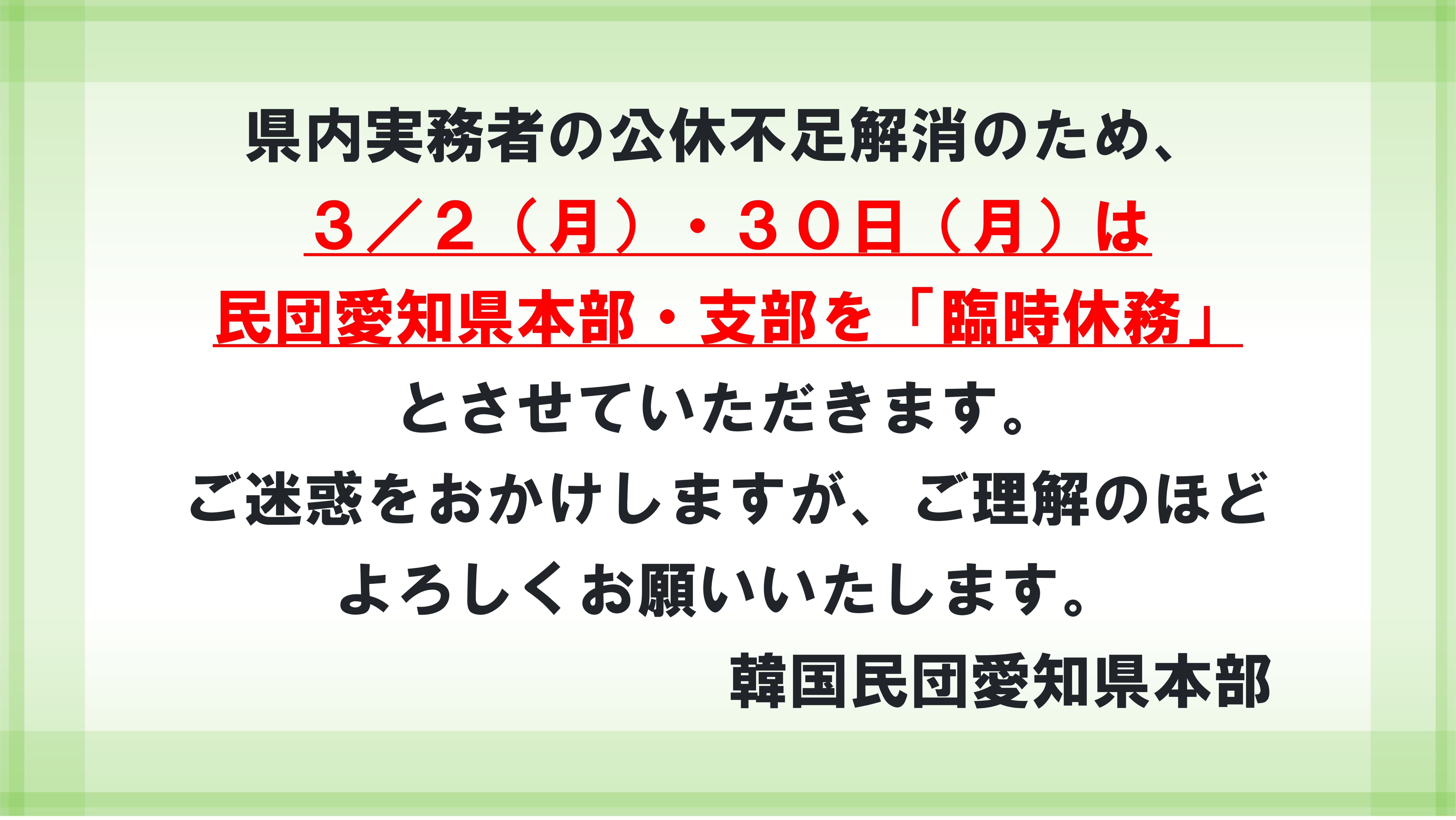 県内実務者の公休消化不足を解消すべく、下記日程におきまして民団愛知県本部・県内各支部は「臨時休務」とさせていただきます。