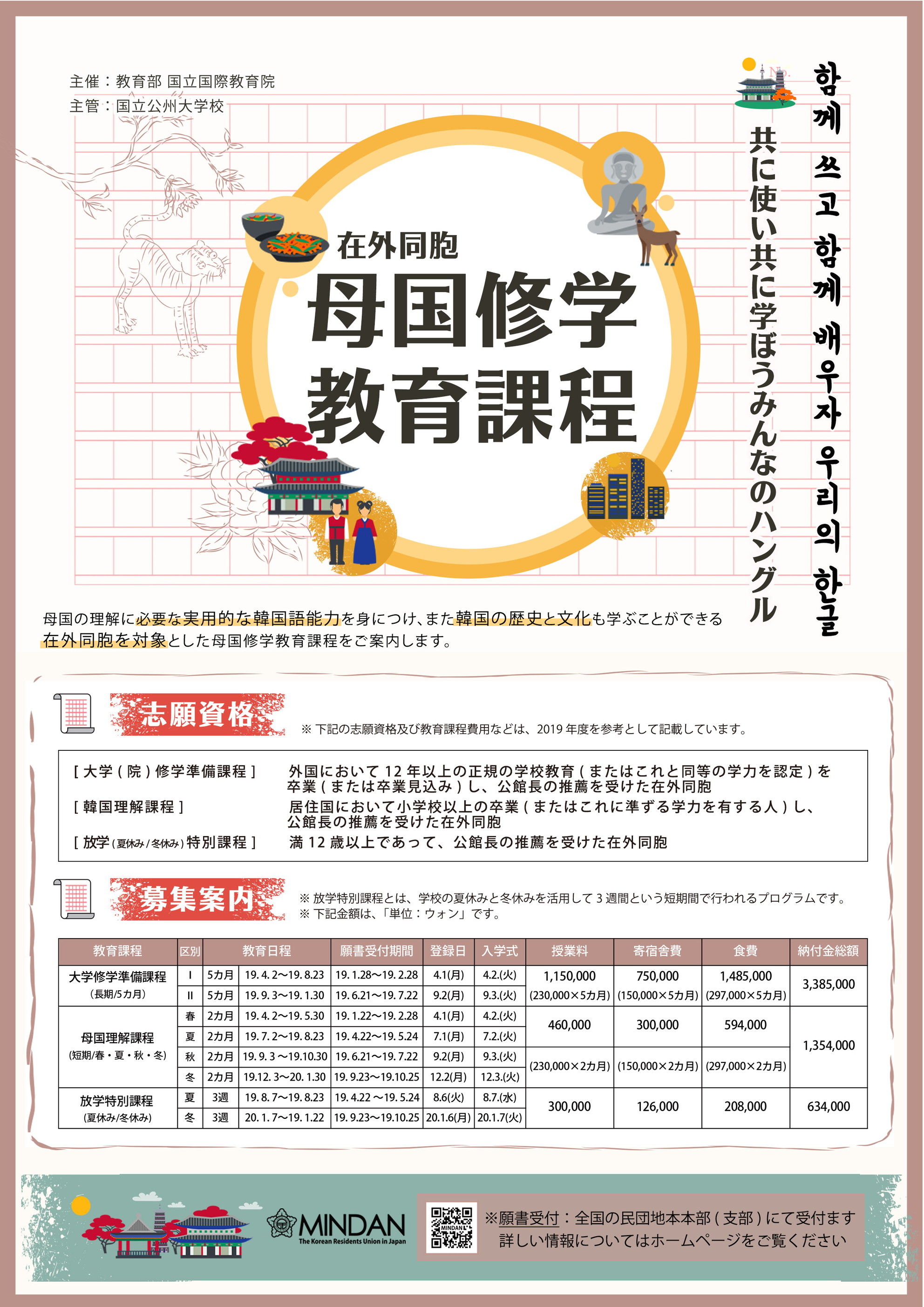 국제 사회에서 활약하는 인재를 육성하기 위해 국립 국제 교육원이 주최하는 '2019 재외 동포 국내 교육 과정 (모국 수학)' 참가를 적극적으로 검토해 주십시오.
