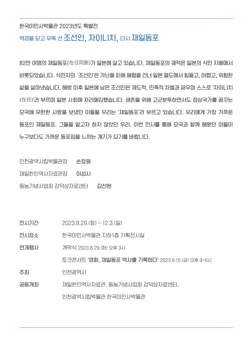 한국이민사박물관(인천시)는 민단중앙본부・ 재일한인역사자료관(이성시관장)과 공동주최로 29일부터 12월3일까지 '역경을 딛고 우뚝 선 조선인, 자이니치, 다시 재일동포' 기획특별전을 개최한다.