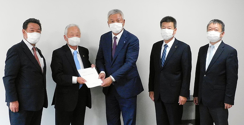 [ 한신협 오용부 회장(오른쪽 세 번째)에게 요청서를 전달하는 여건이 민단중앙단장 ]