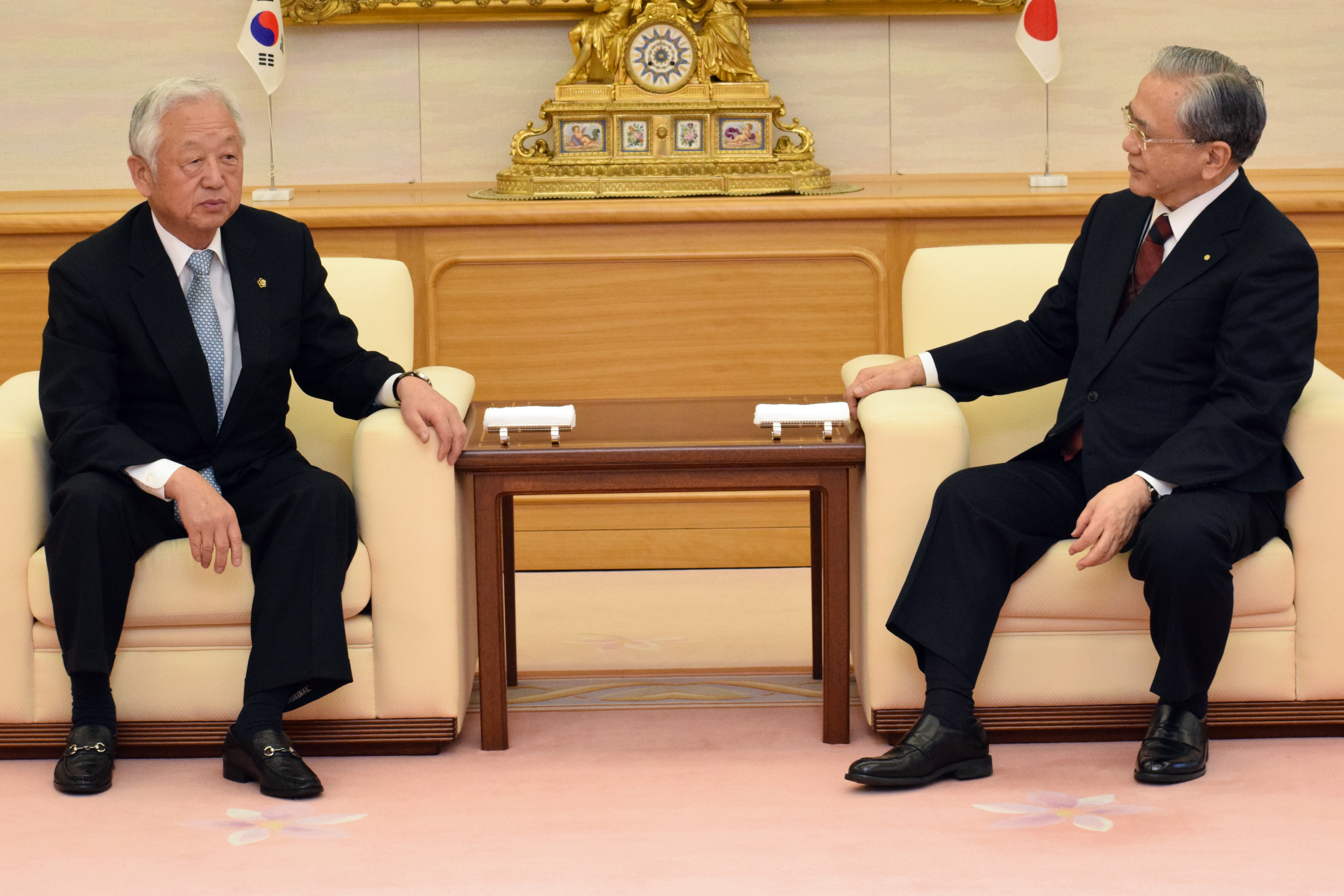 민단 중앙의 여건이 단장(왼쪽)은 15일, 정몽주, 임태수 부단장과 함께 소카 학회 총본부에 하라다 미노루 회장(오른쪽)을 방문해, 한일 우호 친선 활동에 관한 의견을 교환했다. 정치 차원에서는 악화되고 있지만 지난해 양국 국민의 왕래가 1000만명을 넘고 있는 것에 언급하며 "민간의 풀 뿌리 교류가 중요하다.서로 협력하자" 고 다짐했다.