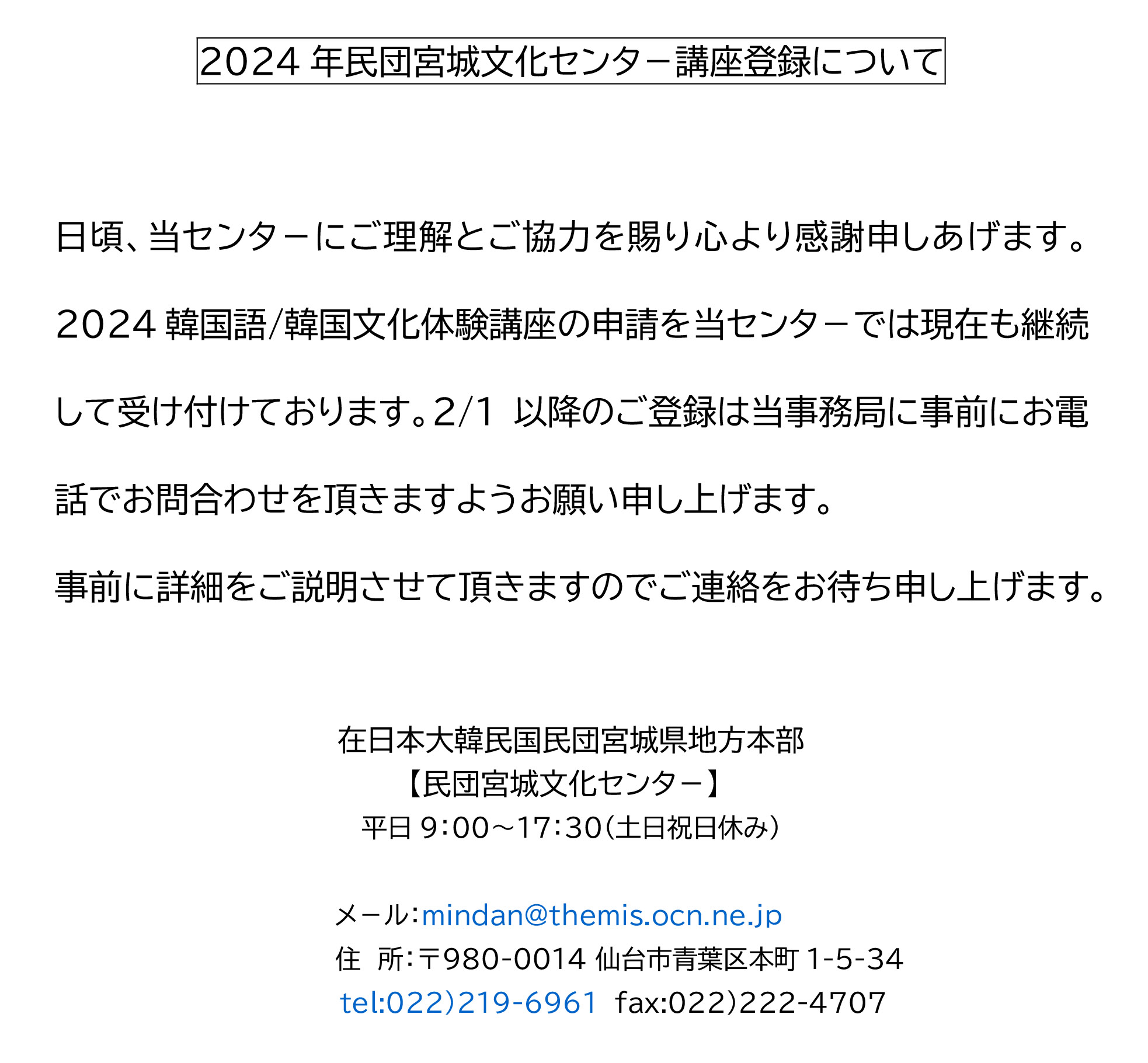 2024年民団宮城文化センタ-講座登録について