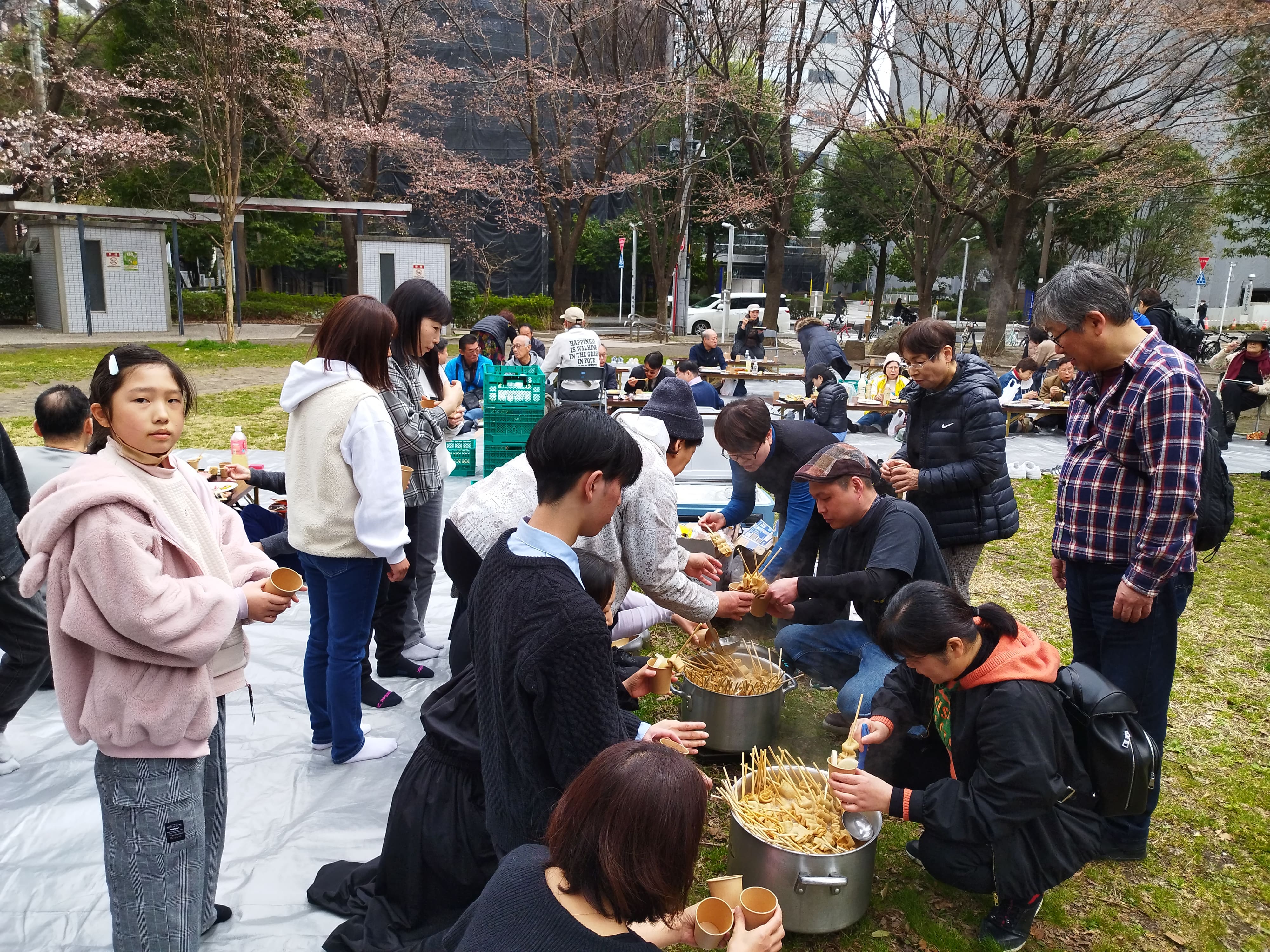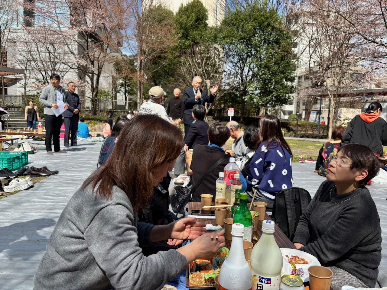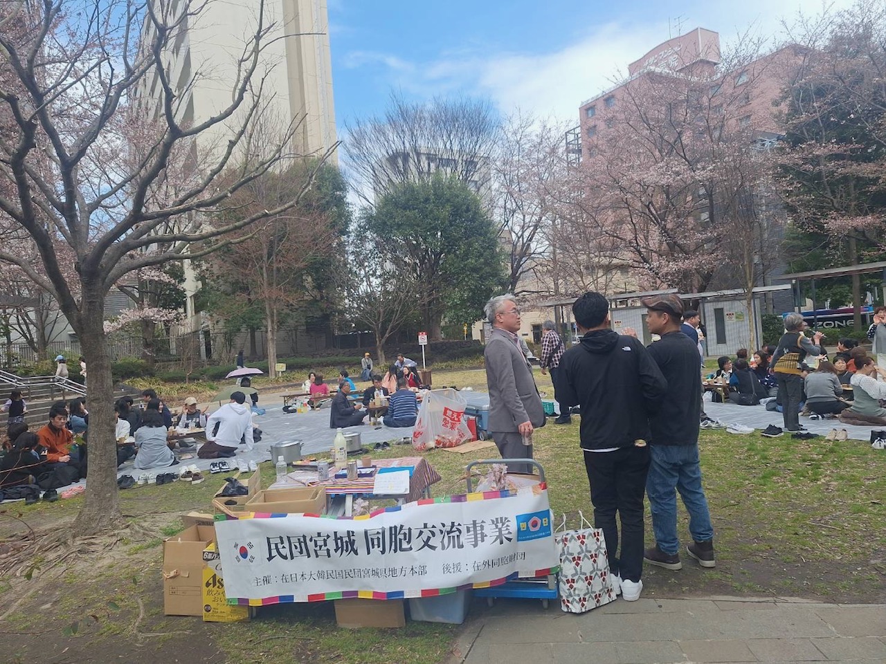 2025年4月6日春の花見韓日交流会に李秉浩駐仙台韓国副総領事、鈴木繁雄宮城県日韓親善協会副会長、金田俊久あすか信用組合仙台支店長、花京院町内会員様、民団宮城文化センタ-登録生、ハングル学校参加者の50名程の親子、団員含む120名が花京院町内会の「ドングリ公園」に集いました。