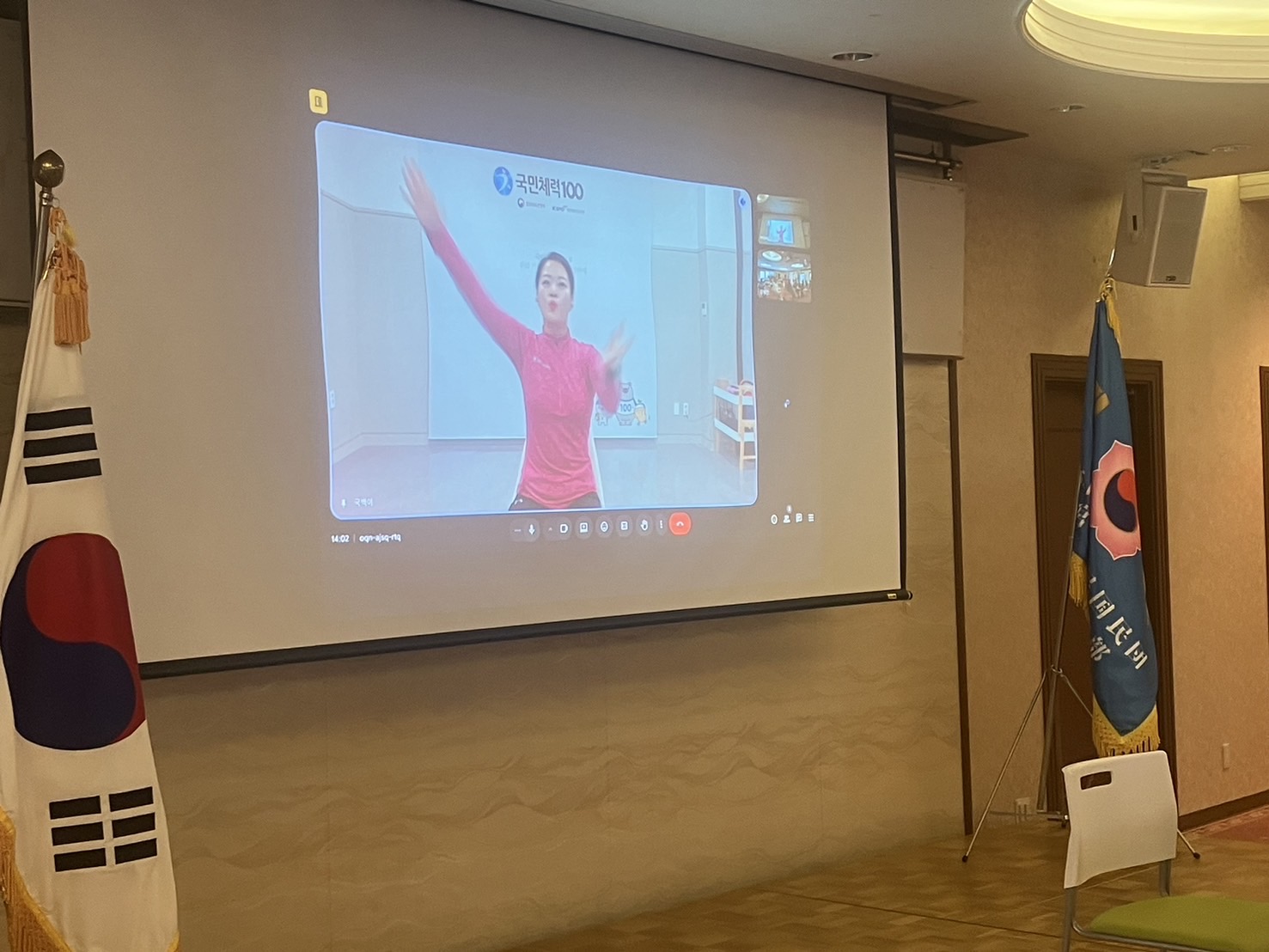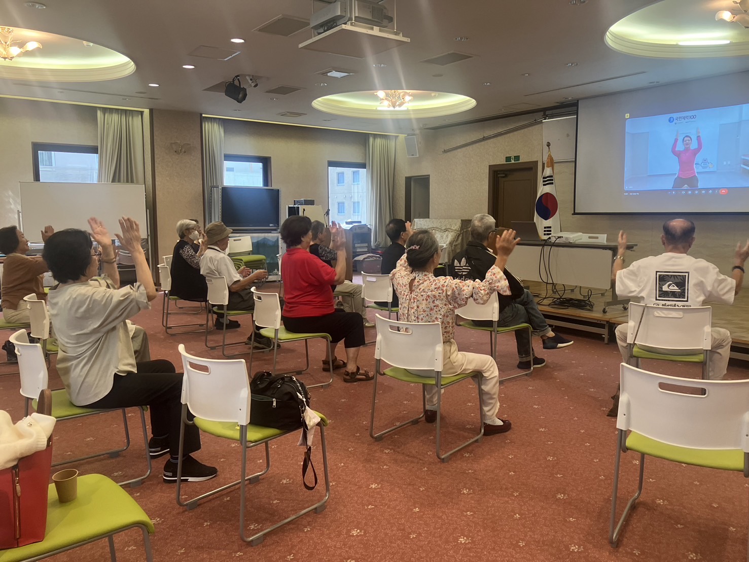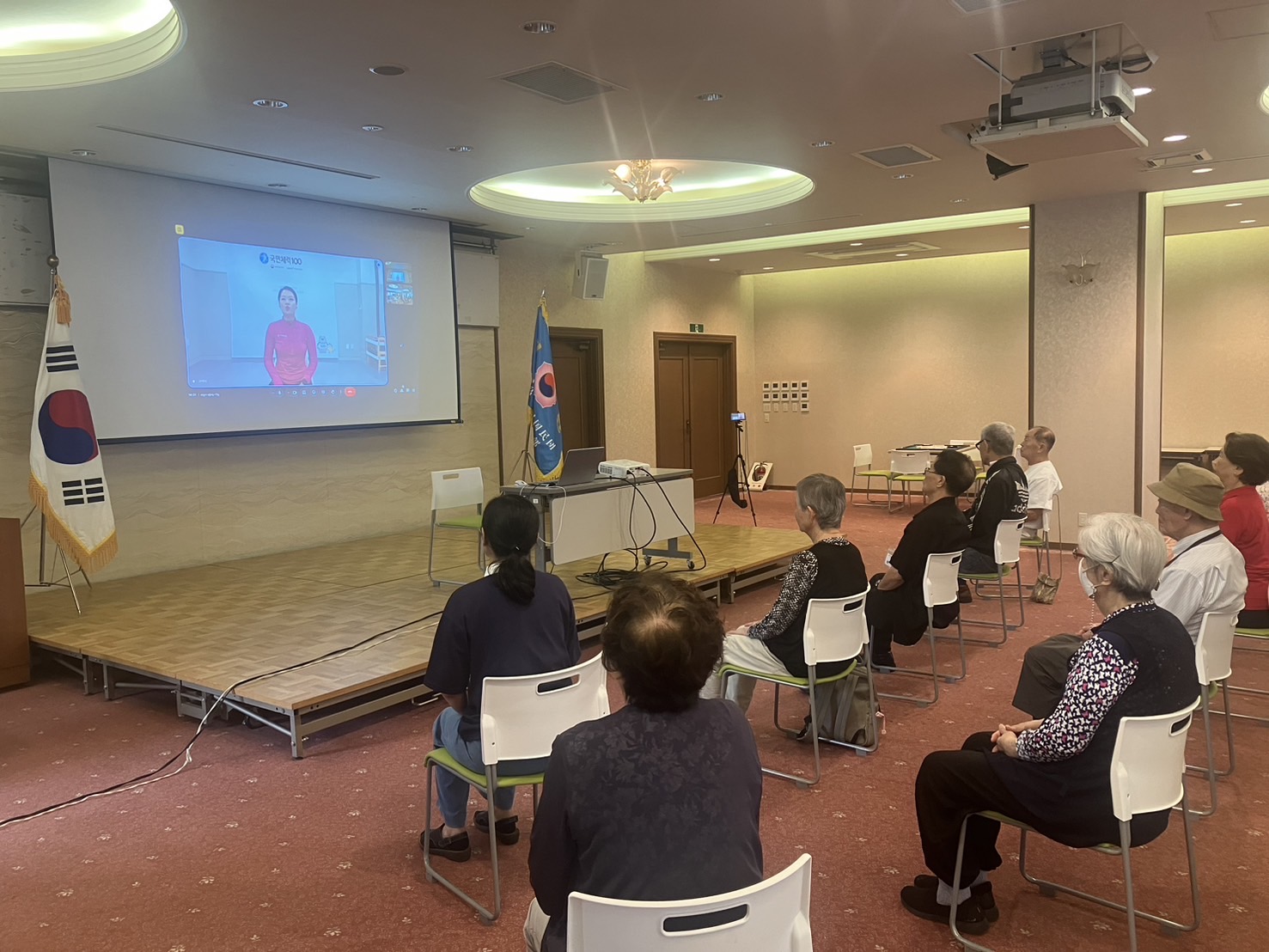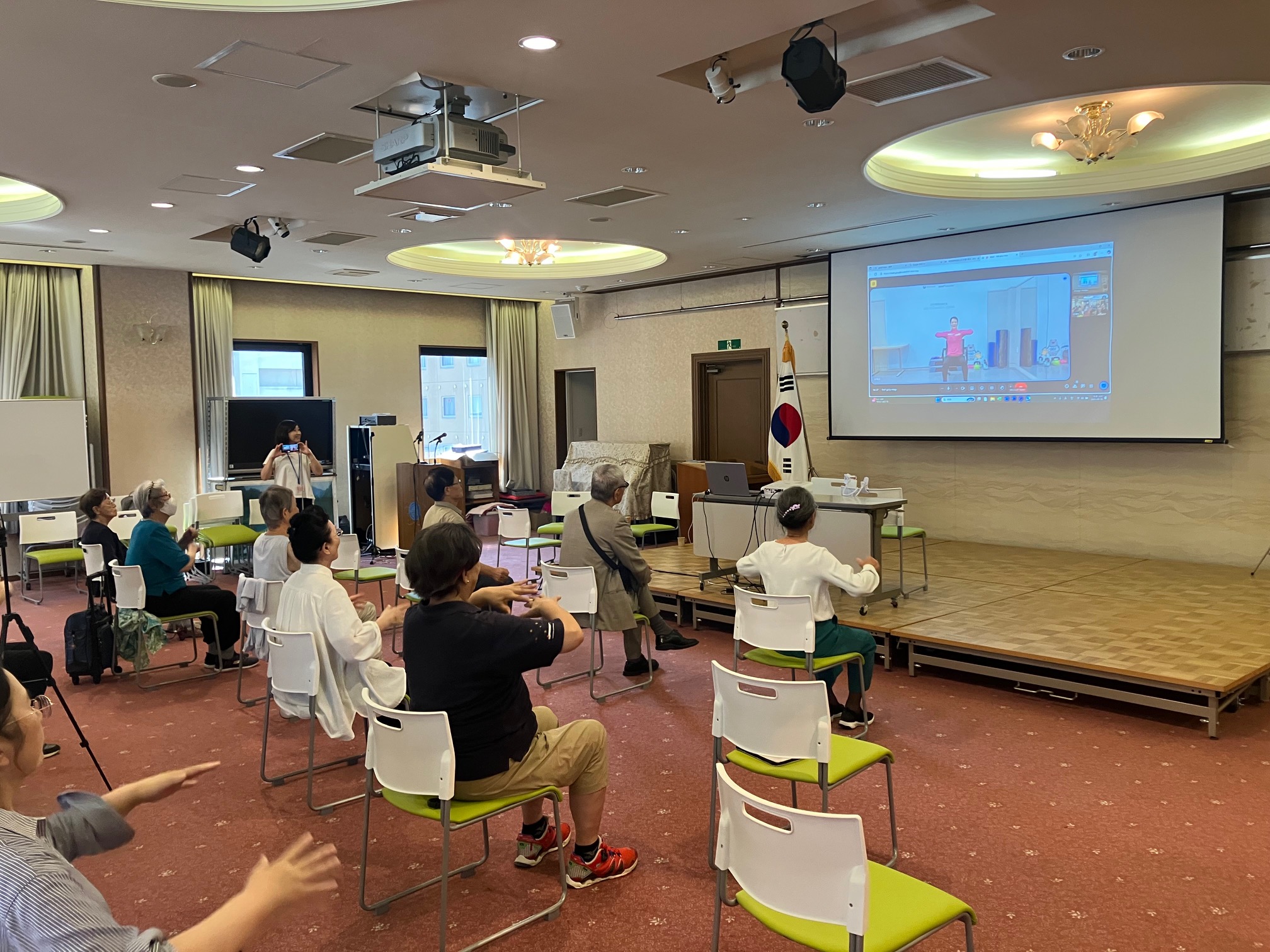 韓国とオンラインで繋ぎ、先生の動きを見ながら椅子に座ってストレッチや筋力トレーニングを行いました。