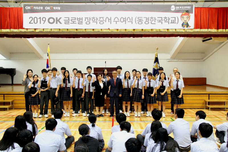OK培貞奨学財団(崔潤理事長、ソウル市)は8月27日、東京韓国学校に在籍する在日同胞の中学生14人と高校生6人の計20人に「2019年OKグローバル奨学生奨学証書」を手渡した。 同財団はOK貯蓄銀行やOKキャピタルなどを傘下に置くグローバル総合金融グループ「アプロサービスグループ」の崔会長が02年に設立した。東京韓学をはじめ...