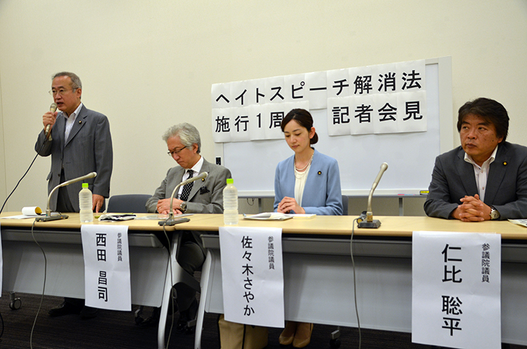 「対策法」の成立に尽力した参議院法務委員会の与野党議員4人が2日、同議員会館で記者会見した。 自民党の西田昌司氏は「国会の意見として、ヘイトスピーチがよくないと示せたのは大きい」と意義を強調した。公明党の佐々木さやか氏も「理念法だがヘイトスピーチ対策が進んできている」と評価した。 一方、共産党の仁比聡平氏は「...