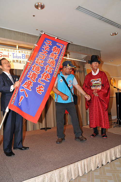 「朝鮮通信使を世界記憶遺産に」と染めぬかれた幟(ノボリ)旗が22日、「第5次21世紀の朝鮮通信使 ソウル‐東京友情ウオーク」の韓・日両隊長から河村建夫自民党衆議院議員(日韓親善協会中央会会長)に手渡された。幟旗は4月23日、対馬市役所で朝鮮通信使縁地連絡協議会の松原一征理事長から託されたもの。韓・日のウオーカーに守られながら、日本各地の縁地を経由して...