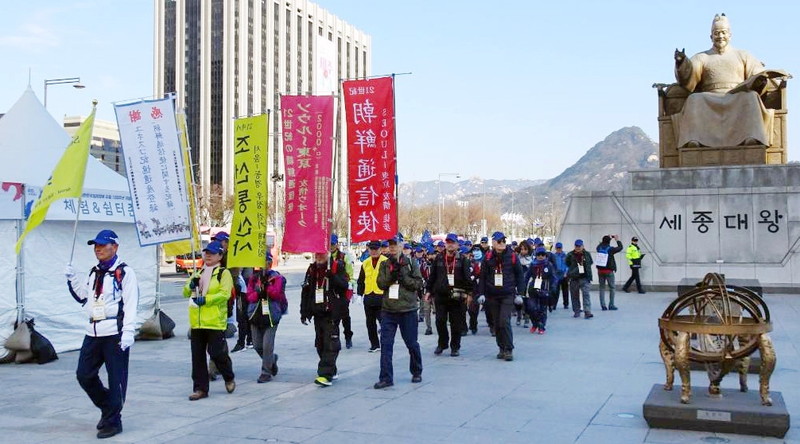 「21世紀の朝鮮通信使ソウルー東京 友情ウオーク(主催=日本ウオーキング協会・韓国体育振興会・朝鮮通信使縁地連絡協議会。民団中央本部など後援)」が4月1日朝、ソウル・景福宮から東京(5月23日ゴール)に向けてスタートした。 ソウルから東京までの道のりは約2000㌔。ソウルー釜山・大阪―東京はウオーク(1、158㌔)、釜山―対...