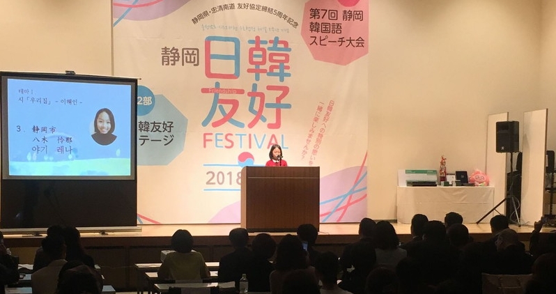 【静岡】民団静岡本部(李宜弘団長)は1日、県と忠清南道との友好協定締結5周年を記念する「日韓友好フェスティバル」を開催した。駐横浜総領事館との共催。 韓国語大会の暗唱部門には7人が出場。大賞は詩「我が家」(李海仁作)を選んだ八木玲那さん。自由スピーチ部門は9人のなかから酒井瑠歌さん(「韓国と日本、『ウリ』が大賞に輝いた。