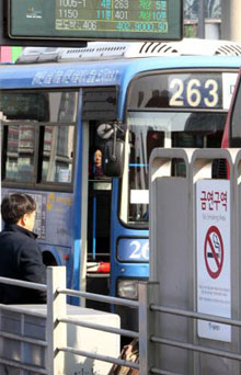 今月から、ソウル市内の全てのバス停が禁煙区域になった。喫煙すれば、罰金10万ウォンが科せられる。ソウル駅の乗り換えセンターにも、「禁煙区域」の案内標識が貼付された。(2012.3.14 民団新聞)