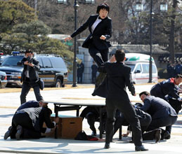 26・27日にソウルで開催される核安保サミットを前に、青瓦台の警護員によるテロ対策訓練がこのほど披露された。英大衆紙「ザ・サン」は、各種武術や警戒態勢、暴動鎮圧用の催涙弾噴射などを紹介しながら、特にタキシードを着た女性警護員の空中蹴りについて、「まるでジェームズ・ボンドが出演する映画のワンシーンのようだ」と評価した。(2012.3.14...
