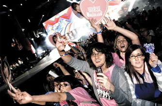 米ニューヨークのマディソン・スクエア・ガーデンで行われた「K‐POPワールドツアー・コンサート」会場。SHINeeや少女時代、BoA、東方神起らが登場するや、会場を埋め尽くした1万5000人のファンは「サランヘヨ!」(愛してる)と韓国語を叫びながら歓喜した。あるファンは「韓国の歌手たちはさまざまな方法でファンを楽しませてくれる。韓国語も勉強中だ」と韓...