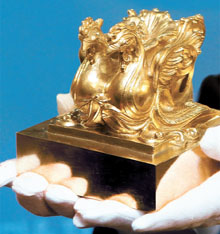 新しい国璽(5代目)が4日、ソウルの政府中央庁舎で公開された。金2.6㌔に銀・銅・亜鉛などを混ぜた合金。今回は強度を高め、亀裂を防ぐためイリジウムを含ませた。縦・横・高さともに10.4㌢、重さは3.38㌔。現在使用中のものに比べて大きくなった。印文には鳳凰1対とムクゲが彫られ、「大韓民国」の文字は訓民正音解例本の書体。制作費用は2億1500万ウォン。...