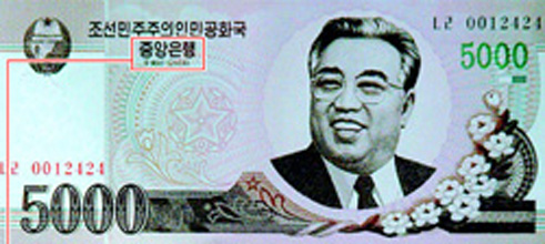 100㌦紙幣などの偽造疑惑をたびたび受けている北韓だが、金日成主席の肖像画を描いた5000ウォン紙幣の偽札が平壌市などで大量に発見され頭を痛めている。偽札組織を探し出すための専門チームが組織されたと、対北メディアの北韓戦略情報サービスセンター(NKSIS)が8日報道した。(2011.5.11 民団新聞)