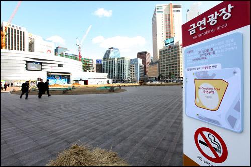 禁煙広場…3月からソウル中心部の3広場(市庁前と清渓川、光化門)に看板が立てられた=写真。煙草を吸ってはいけない禁煙区域とそのエリアを表示し、違反すれば、罰金(10万ウォン)を払わされる。愛煙家の皆さん、くれぐれも注意を。(2011.3.16 民団新聞)