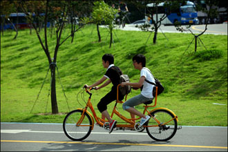 ソウル汝矣島の漢江市民公園。漢江ルネサンスの一環として、川辺には自転車が走れる道路が整備され、市民の人気レジャーになりつつある。汝矣島では、麻浦大橋と元暁大橋2カ所に、大人や子供用、タンデム車など、1000台を超す自転車をそろえている。1時間あたり3000ウォン、カップル自転車は6000ウォン。借りる際、身分証明書が必要なので旅行者は旅券を忘れないように。...