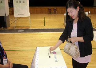 2日に実施された地方選挙での外国人有権者は1万2878人と、選挙管理委員会が発表した。写真上は、韓国に居住15年目にして初めて投票する日本人女性。一方、投票所として、フグ料理店や駐車場のテントが使用された。1月に改正された公職選挙法により、今回から教会や寺院など宗教施設に投票所を設置できなくなった。その影響で、釜山市巨済では投票所確保が難しく、やむなき代替...