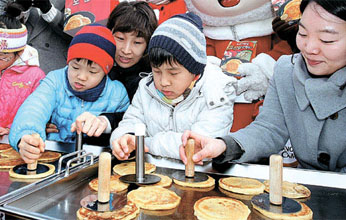 13日、ソウル清渓広場で「ホットク(お焼き)1万個分かち合い」イベントが行われた。CJ第一製糖の社員と子どもがホットクを焼いて募金活動を展開。年末まで光化門、明洞などで行われる同イベントでの募金は、子ども・青少年教育交換の場である「CJドナースキャンプ」に全額寄付される。 (2009.12.23 民団新聞)